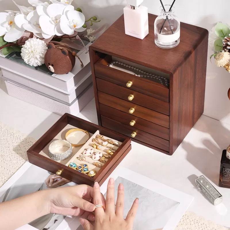 Inside, intelligently designed compartments ensure every piece—be it delicate necklaces or bold statement rings—finds its perfect, dedicated space, while the expansive interior meets a variety of storage needs.
