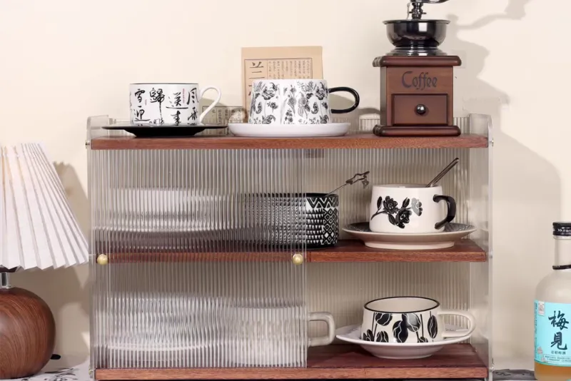 Our products are crafted from solid wood and acrylic materials, featuring New Zealand pine, walnut, and durable acrylic plexiglass. The dustproof sliding door design ensures cups and other items remain clean, while the transparent sliding doors provide a clear view of stored items. The spacious interior accommodates cups, saucers, and more, while the finely sanded logs create a smooth, delicate texture. The surface is treated with wood wax oil, making it waterproof and moisture-resistant. Additionally, the top space is perfect for storing or displaying ornaments, offering both strong storage and decorative functionality.
